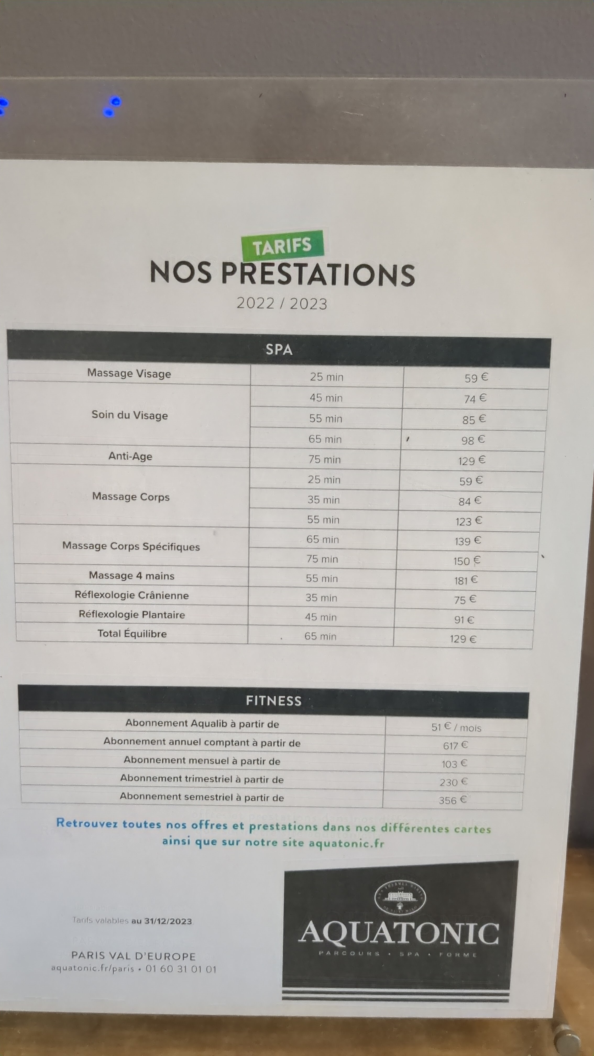 Posté le 26/01/2024 à 07:58"Réservation obligatoire maintenant pour le spa Aqua tonic.... Surprise 41 euros l'entrée ! Belle augmentation.... Tout ça pour une structure très vieillissante... Plus de lumière dans les toilettes... Plafond Dont la peinture s'ecaille ... Eau avec quelques degrés en moins... Bon déçue.... Heureusement les massages sont toujours au top 🤪..."