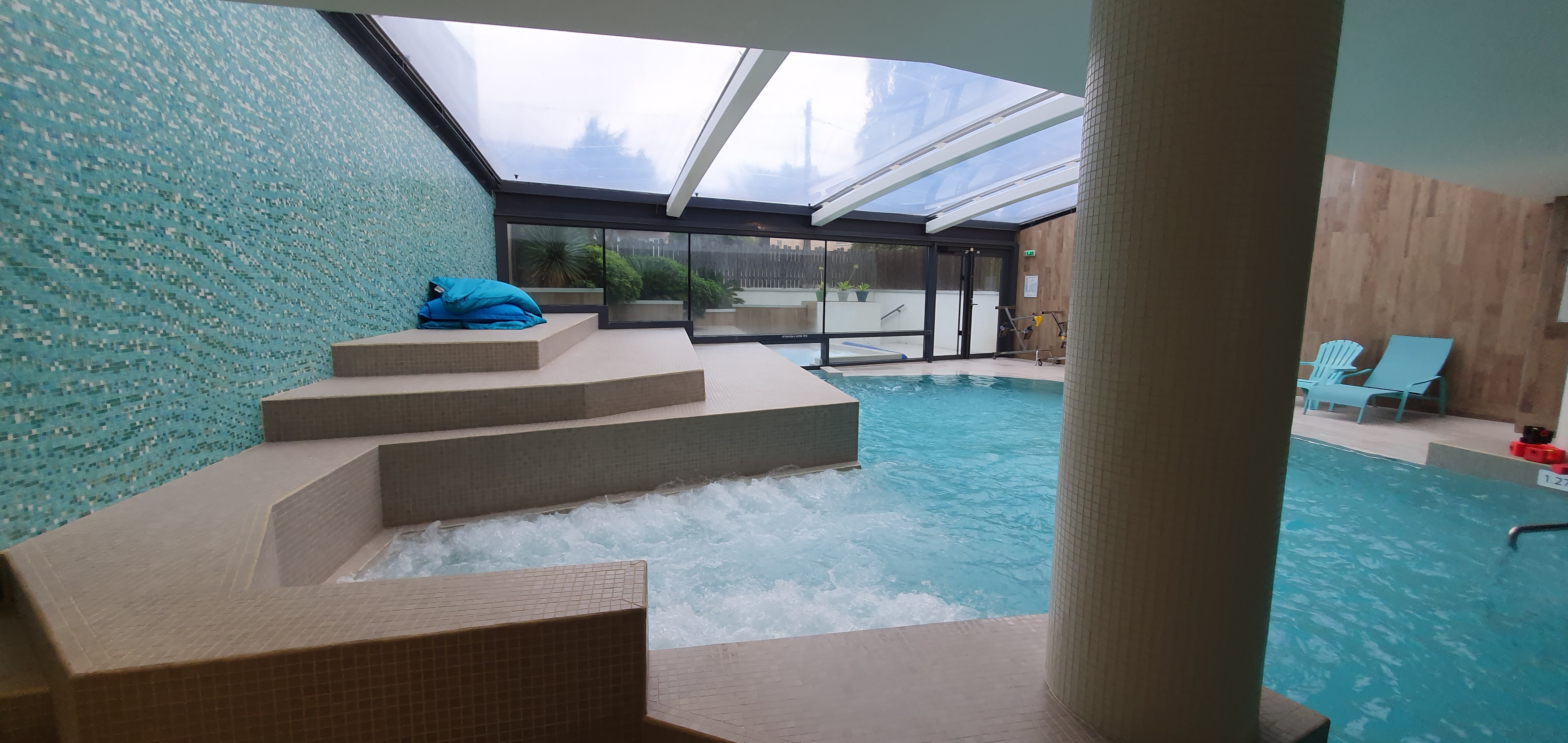 Posté le 26/08/2023 à 17:41"L'espace piscine est super! Une trentaine d'euros pour 1h45 d'accès au bassin d'eau de mer chauffée avec couloir de nage à contre courant (on fait du sur place c'est drôle), des jets massants pour le dos, les jambes, les pieds, jaccuzzi extérieur et intérieur et accès au hammam. Très joli et agréable. Une belle alternative en cas de mauvais temps!"